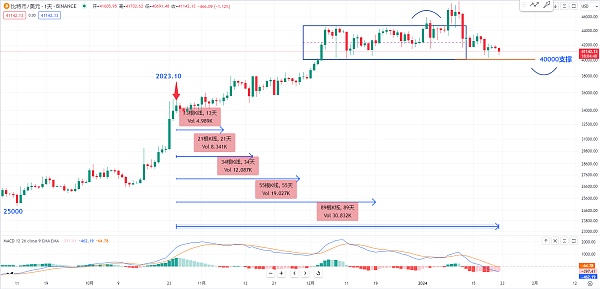 就是从2023年的10月份的这一根K线开始 后面都存在着一个斐波拉契数列 每一次转折向上的一个走势 然后今天是1月22号 也是89的一个时间转折 所以目前的这个位置最好是能够撑住 而且在日线级别里面这个40000的关口到底能不能守住其实我心里也没有底