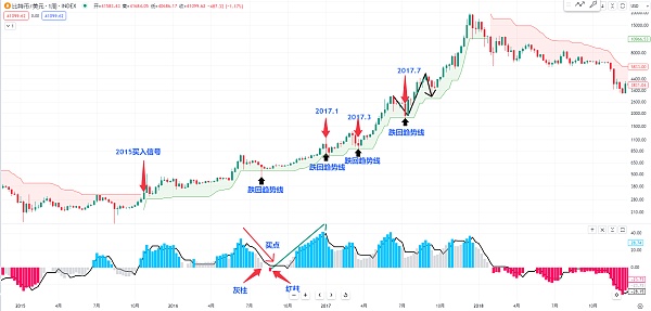 或者我们可以再观察一下比特币在2015年到2017年的牛市 这里面每一次买点的位置看起来是不是非常的清晰 我们可以观察一下2015年比特币超级趋势指标 出现买入的信号 后面是一大波从来都没有转红过 他是一直在呈现上升的结构