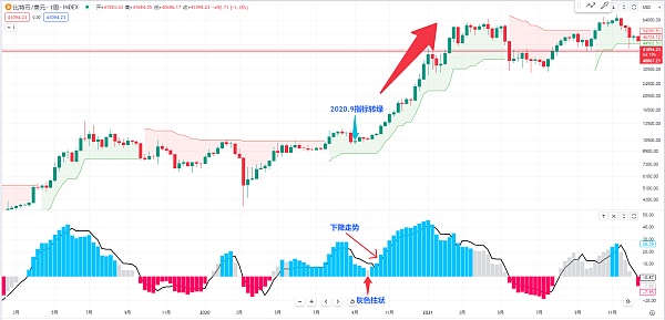 或者我们可以观察一下比特币在2020年的9月份 当时在这边也是超级趋势指标开始转绿 买入的信号出来 每一次有跌回来的位置 我们就去找下方的这个qqe的柱状 他在呈下降的走势 或者是在这根灰色的柱状他跌不下去 那有可能后面就开始呈上升的柱状 后面就是一大波牛市