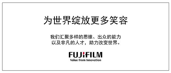 此次制定的集团使命用“笑容”诠释富士胶片集团希望通过旗下所有业务打造出的未来愿景。我司自创业以来,基于先进、独特的技术推出产品和服务,给人们带来笑容。今后我司也将在广泛的业务领域充分活用公司内部多样的思维、出众的能力以及非凡的人才,助力改变世界,目标成为一家能够创造更多“笑容”的公司。同时,作为集团使命的驱动力,每一位员工都胸怀远志迎接挑战、不断为世界绽放更多笑容,这也将实现公司的持续发展。