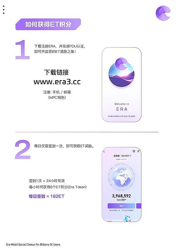 ET是用户参与Era Network的权益奖励,根据用户参与度公平分配。用户无需投入专业矿机或资金,完全免费参与。除此之外,用户除了可获得ET积分,还能够在平台上获取源源不断的优质项目空投奖励。这意味Era Network将为Web3世界带来海量的真实用户,杜绝过去行业所面临的女巫攻击,真正发挥Web3企业的代币激励作用,为参与贡献的用户带来正向的价值回报。