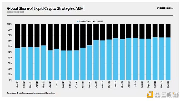 积极管理的策略对于机构级加密的发展至关重要。无论是对冲基金还是风险投资基金,它们都充当了支持体系,促进了更广泛的加密用例的发展和采用。尽管绩效很重要,但这些投资工具为2022年充满复杂性的行业提供了流动性和机会。从2023年的大部分情况来看,对许多加密对冲基金和风险投资公司而言,这可能是一个充满挑战的时期,因为被动/基准产品占据了市场主导地位。正如在以前的周期中所看到的,专注于高质量机构基金产品的经理,通常在加密原生有限合伙人的支持下,将在市场反弹中生存并获益。