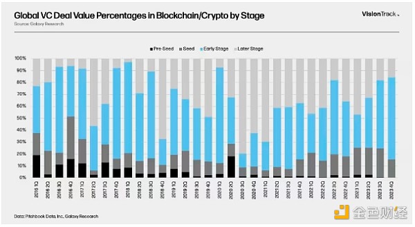 在2023年第四季度,加密创业交易的中位交易规模从第三季度的325万美元降至300万美元。对于所有交易来说,自2016年以来的历史中位数是140万美元的交易价值。值得一提的是,自2016年以来的前十二个季度都超过了这个中位数交易价值。自2016年以来,只有三个季度的中位交易规模超过了300万美元的交易价值,这表明尽管交易数量和价值下降,但早期交易更加昂贵。换句话说,加密创业投资者不仅自2016年以来增加了他们的最低投资金额,而且每年在部署资金方面也变得更具战略性。此外,在过去的几个季度中,所有VC的中位交易规模首次超过了加密创业,这表明加密公司的估值有所下降。