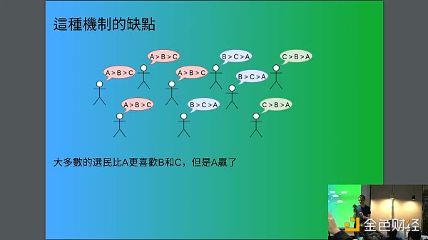 谈到目前传统投票系统的局限性和缺点,Vitalik 抛出一个基本问题:为什么仅仅投票给 A 或 B 不够好?他用一个简单的例子来说明这一点,其中九名选民分别支持不同的候选人,A 得到四票,B 得到三票,C 得到两票。在这种情况下,虽然 A 看似获胜,但 A 并不是最受大众欢迎的选项。