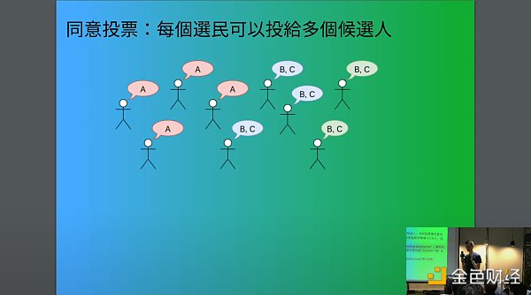 接着,Vitalik 讲解了另一种投票方法:同意投票(Approval Voting),同意投票法中,选民可以为任意数量的候选人投票,包括一个、两个、三个,甚至不投票。
