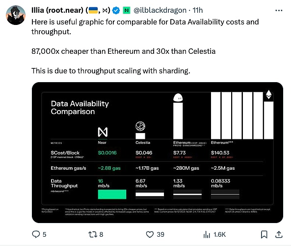 这两天 DA 话题很热闹,Celestia 和 NEAR Protocol 都要做第三方 DA,NEAR 和 Polygon 的合作更是喊出了比以太坊便宜 8000 倍的口号!