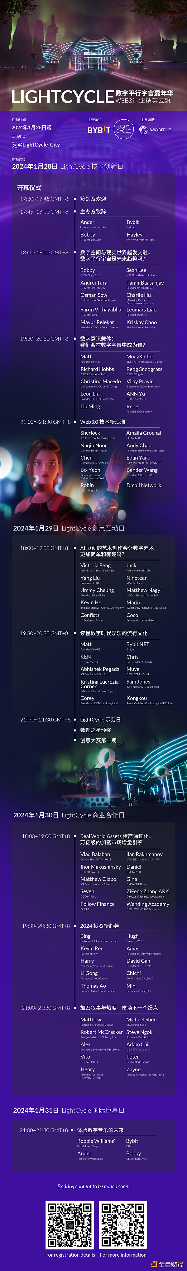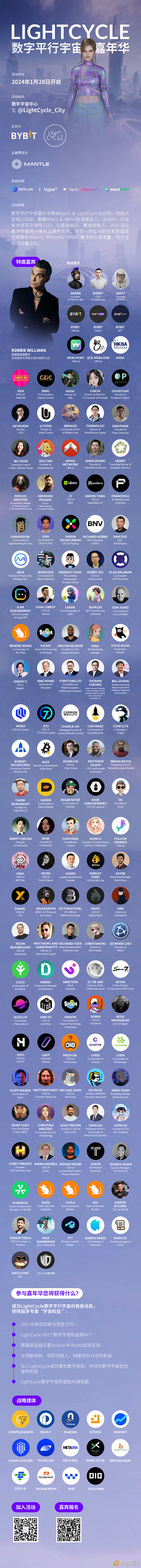 作为开年最大规模的线上巅峰盛事,LightCycle数字平行宇宙嘉年华,即将于2024年1月28日在X Space(@LightCycle_City)隆重开幕。嘉年华由LightCycle与Bybit联合主办,Mantle赞助,汇聚超200位国际知名学者、技术专家、企业家和投资人,共同探讨Web3技术在数字经济领域的前沿创新,揭示行业内最新的技术进展和前瞻思考,以及如何深化Web3与Web2生态资源的联系,加速这些技术在实际生态中的应用。