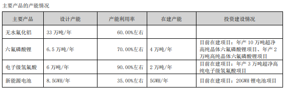 记者注意到,多氟多无水氟化铝的设计产能为33万吨/年,产能利用率60%;电子级氢氟酸设计产能为6万吨/年,产能利用率90%左右,在建产能2万吨/年,目前在建项目是年产3万吨超净高纯电子级氢氟酸项目。