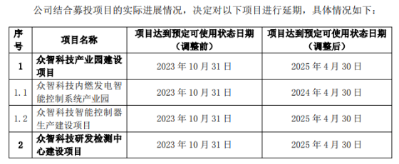 2023年10月底,众智科技公告称,公司上市募投项目“众智科技产业园建设项目”、“众智科技研发检测中心建设项目”达到预定可使用状态的日期由2023年10月31日延期至2025年4月30日。