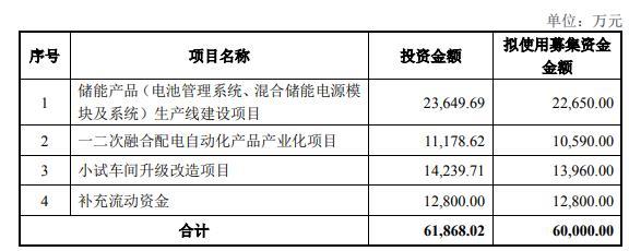 大烨智能2023年度向特定对象发行A股股票预案(修订稿)显示,本次向特定对象发行股票募集资金总额不超过60,000.00万元,扣除发行费用后拟投资于储能产品(电池管理系统、混合储能电源模块及系统)生产线建设项目、一二次融合配电自动化产品产业化项目、小试车间升级改造项目、补充流动资金。