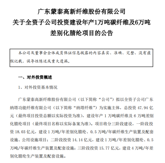 蒙泰高新也提示称,上述碳纤维项目后续尚需通过广东省揭阳市政府职能部门的一系列审批程序方能实施。由于相关审批通过的时间存在不确定性,项目存在推进速度低于预期的风险。