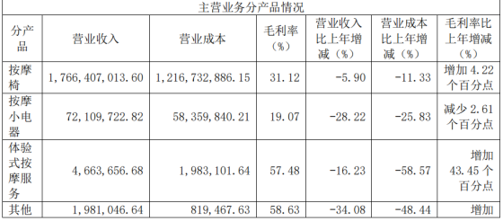 与此同时,荣泰健康按摩椅、按摩小电器及体验式按摩服务等三大产品的营收在2023年均出现下滑。其中,按摩椅取得收入17.66亿元,同比下滑5.90%;按摩小电器的收入为7210.97万元,同比下滑28.22%;体验式按摩服务的收入为 466.37万元,同比下滑16.23%。
