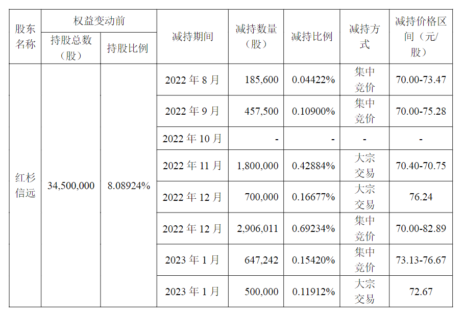 据稳健医疗2023年1月披露的公告显示,红杉信远自2021年11月5日至2023年1月19日期间,通过集中竞价方式和大宗交易方式减持公司股份合计1351.31万股。权益变动报告书签署的前六个月内,红杉信远的减持价格在70.00元/股至82.89元/股。