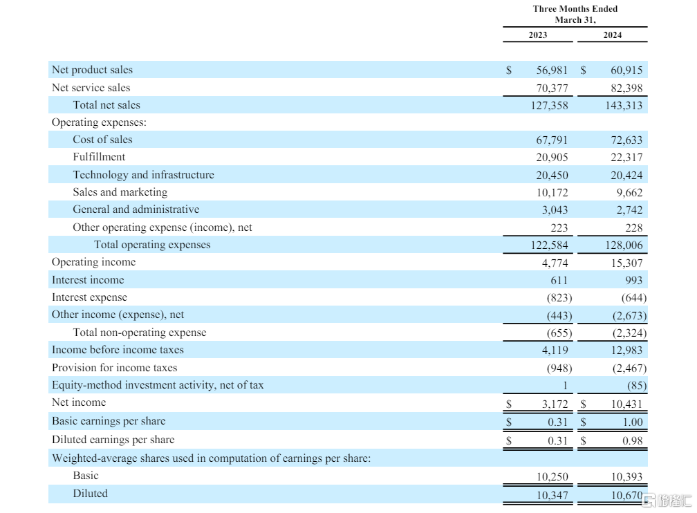财报显示,亚马逊第一季度净销售额为1433.13亿美元,同比增长13%;市场预期为1424.7亿美元,上年同期1273.6亿美元。