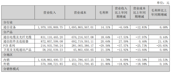 值得注意的是,期内,上述四大产品仅有通信组件及连接器的收入实现增长,而通信电缆及光纤光缆、PCB系列、卫星及无线通讯产品的收入均出现大幅下滑,下降幅度分别为17.53%、37.57%和12.92%。