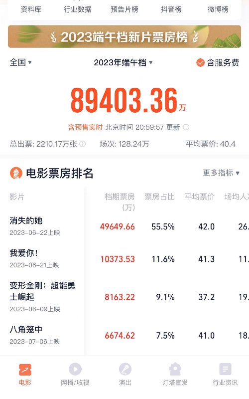 2023年端午档第二天的日票房达3.1529亿元,超过首日票房的3.1509亿元,其中影片《消失的她》贡献突出,单日票房从首日的1.5895亿元上涨至1.7411亿元,成为了今年端午档的“顶梁柱”。