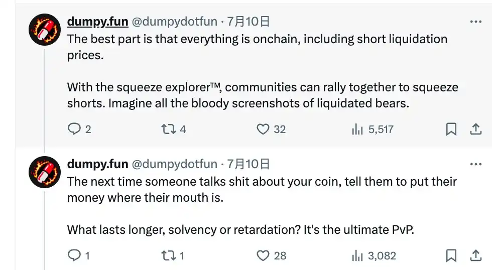 这个名字的意思不言而喻。前有 Pump.fun,开启一场随意发 Meme 的多头狂欢;而这个 dumpy.fun,显然是要形成对比,针对 Meme 币进行做空来开启空投狂欢。