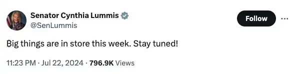 7 月 25 日,支持加密货币的怀俄明州共和党参议员 Cynthia Lummis 正计划在比特币大会上宣布比特币战略储备立法。虽然该法案的具体内容尚不清楚,但据一位看过初稿的人士称,该法案的目的是指示美联储购买比特币并将其作为储备资产持有,就像美国央行持有黄金和外币一样,以帮助管理美国货币体系并保持美元价值稳定。