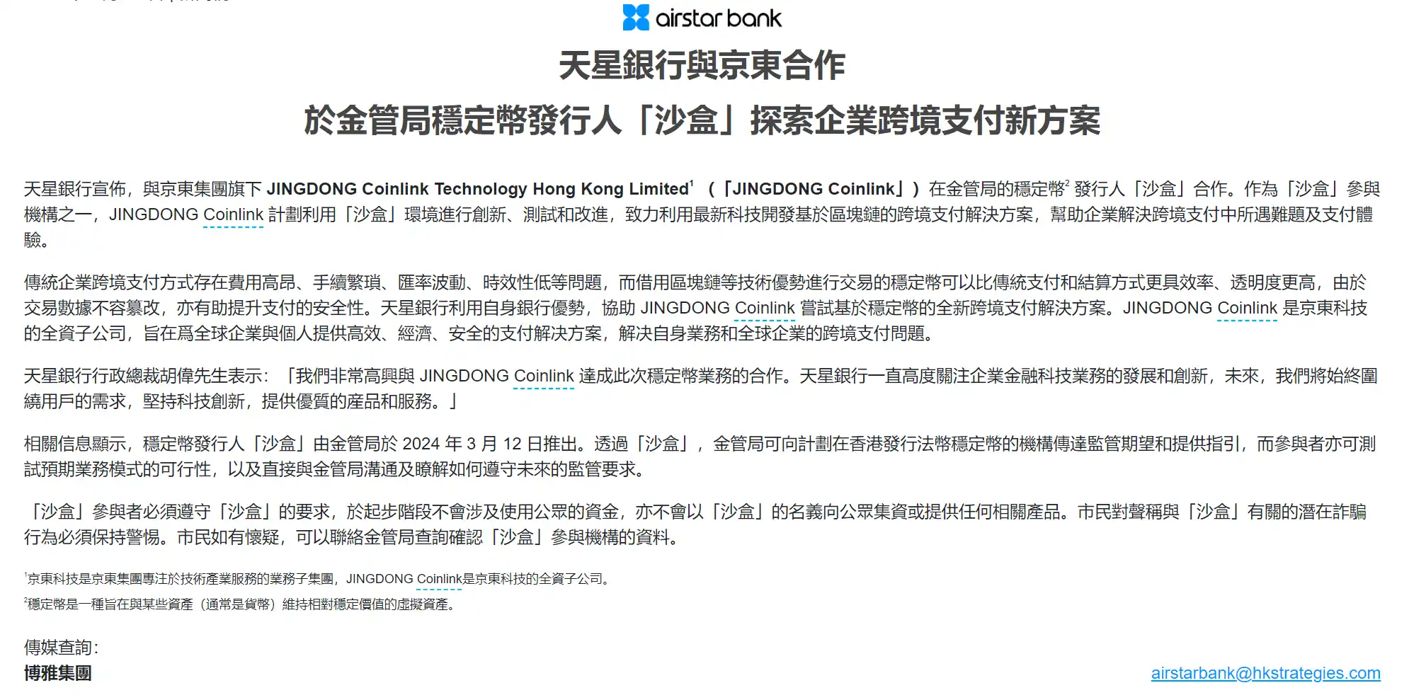 BlockBeats 消息,7 月 28 日,天星银行(Airstar Bank Limited)宣布,与京东集团旗下京东币链(JINGDONG Coinlink)就香港金管局的稳定币发行人「沙盒」合作。作为「沙盒」参与机构之一,JINGDONG Coinlink 计划利用「沙盒」环境进行创新、测试和改进,致力利用最新科技开发基于区块链的跨境支付解决方案,帮助企业解决跨境支付中所遇难题及支付体验。