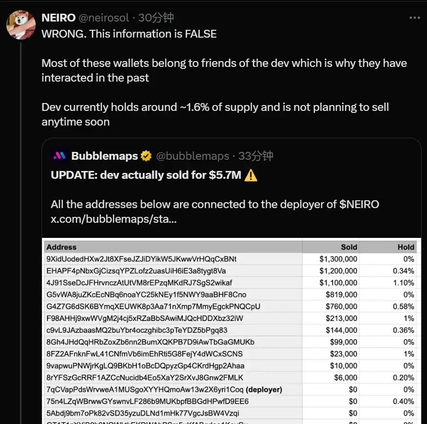 Neiro 开发者在其推文下方回复:「这是虚假信息,这些地址大多属于 DEV 的朋友,Dev 目前持有约 1.6% 的供应量,并且不打算近期出售。」