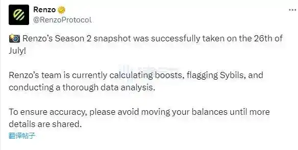 再质押协议 Renzo:第 2 季快照已于 7 月 26 日完成