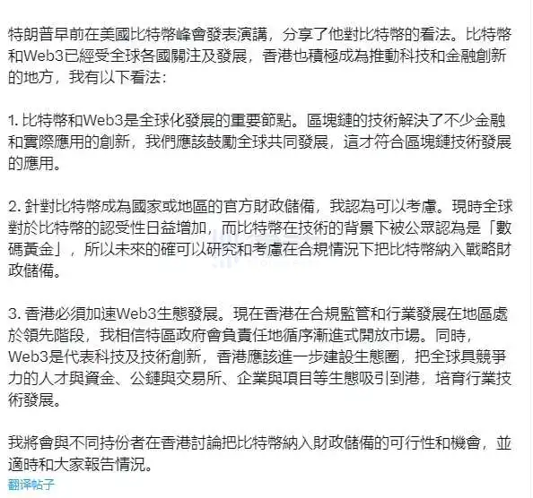 BlockBeats 消息,7 月 28 日,针对特朗普在比特币大会发表的演讲,香港特区立法会议员吴杰庄在 X 平台表示,比特币和 Web3 是全球化发展的重要节点,应该鼓励全球共同发展。