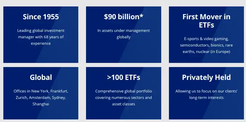 在欧洲,VanEck 于 2008 年开设了第一家办公室,专注于指数业务,随后在 2010 年开设了瑞士办事处,重点关注机构分销和替代及主动投资管理策略的业务发展。2018 年,VanEck 收购了荷兰 ETF 提供商「Think ETF Asset Management B.V.」,以拓展其在欧洲和国际市场的 ETF 产品组合。