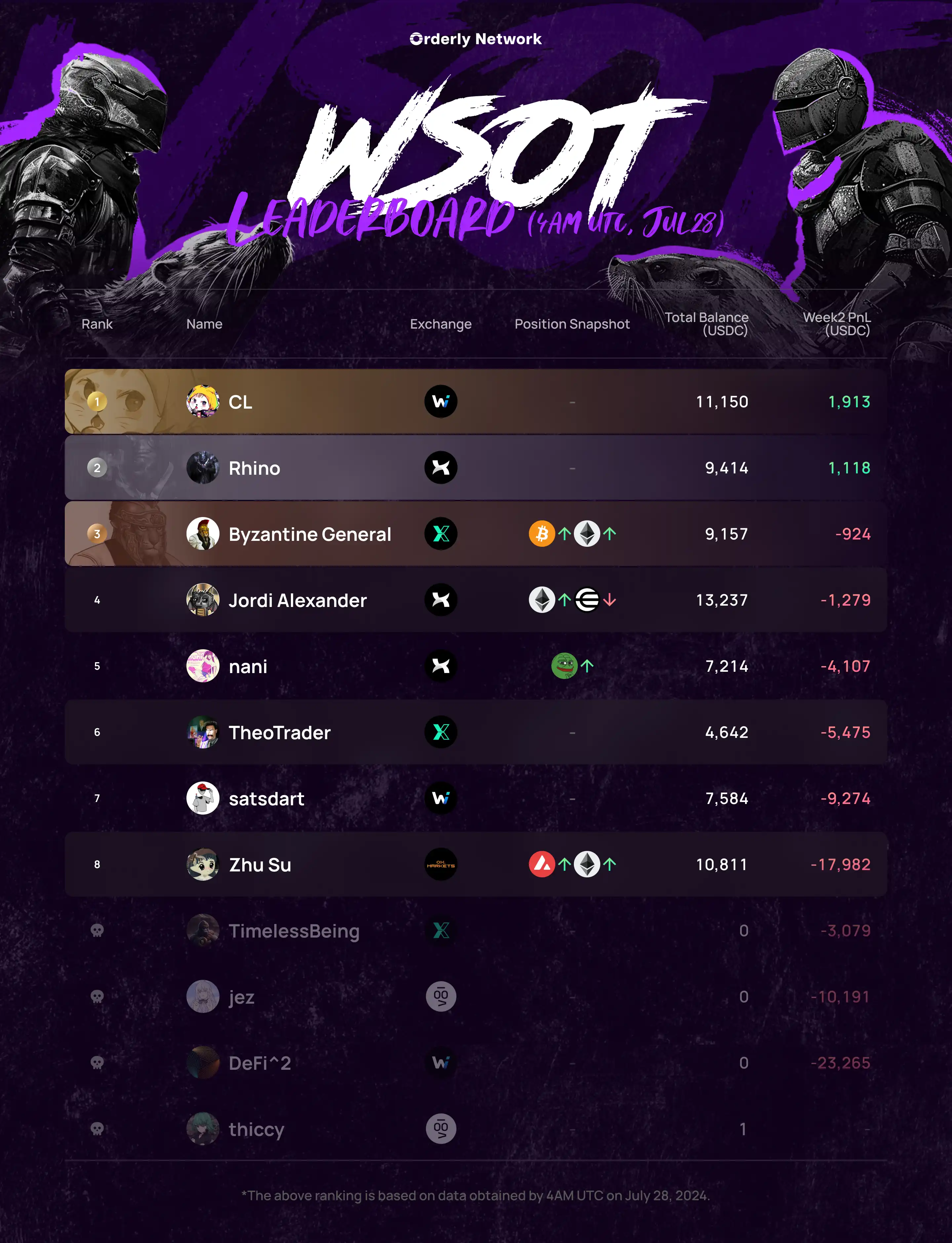 截止 7 月 28 日的战绩,第一名的 CL 总余额为 11,150 USDC,周盈亏为 1,913 USDC。第二名的 Rhino,总余额为 9,414 USDC,周盈亏为 1,118 USDC。第三名的 Byzantine General,总余额为 9,157 USDC,周盈亏为-924 USDC。