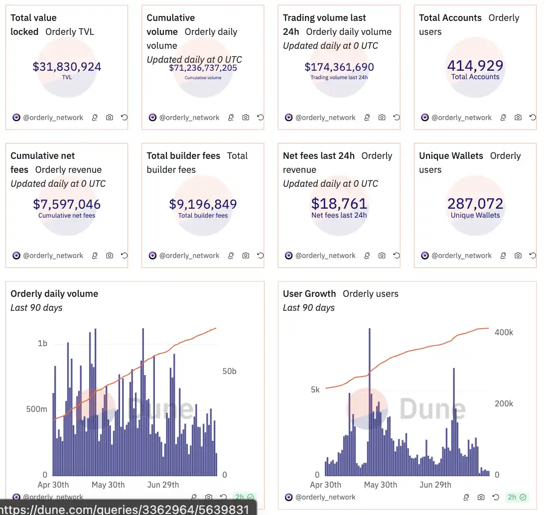 截止目前的数据统计,当前 Orderly 的 TVL 为 31,830,924 美元,累计交易量达到了 71,236,737,205 美元。过去 24 小时内,Orderly Network 的交易量为 174,361,690 美元。目前,共有 414,929 个账户以及 287,072 个独立钱包。