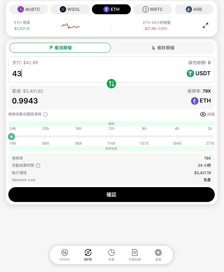 Jasper Vault 0DTE 期权的另一大优势在于其能够保证在指定时间段内不发生爆仓情况。以 24 小时的 ETH 期权为例,Jasper Vault 0DTE 提供的杠杆为 79 倍。在这 24 小时内,无论市场如何波动,投资者的仓位都不会被提前关闭,且最终收益不会受到中途波动的影响。