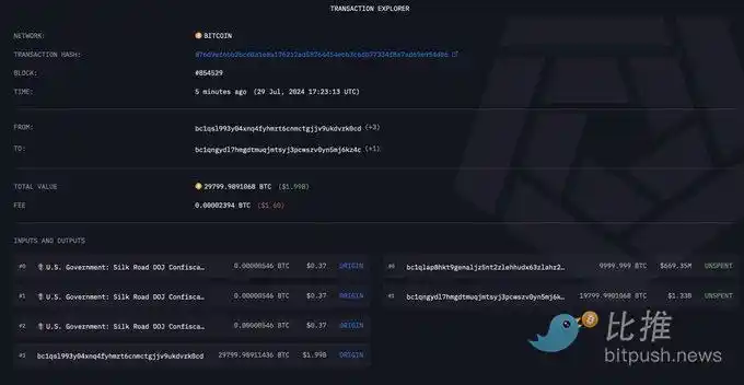 Arkham Intelligence 的区块链数据显示,一个标记为「美国政府:丝绸之路司法部」的钱包将 29,800 BTC 转移到一个没有标记且之前没有交易历史的地址。随后,该地址又将 19,800 BTC 和 10,000 BTC 转发到两个不同的地址。