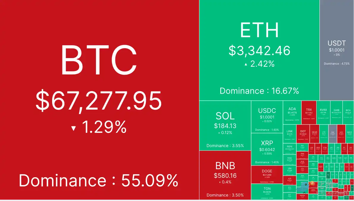 特朗普讲话后,比特币一度回落至 66,650 美元,但周一早盘多头力量再起,将 BTC 推至 70,000 美元的阻力位,市场情绪走高,然而 BTC 接着回落至 67,000 美元的支撑位以下,午盘后跌至 66,393 美元的日内低点。截至发稿时,比特币交易价格为 67,277 美元,24 小时跌幅 1.2%。