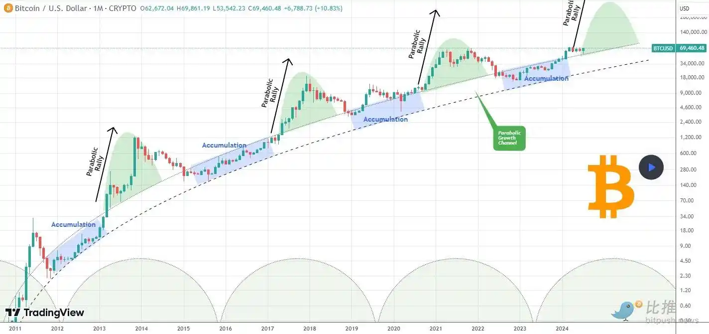 TradingView 分析师 TradingShot 指出,Bitfinex 强调的阻力区与比特币的「抛物线增长通道」一致,这表明一旦克服这一阻力区,比特币将大幅上涨。