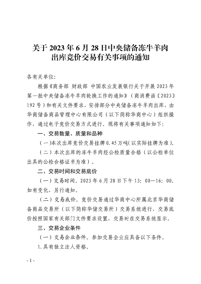 6月26日,华储网发布通知,6月28日中央储备冻牛羊肉投放竞价交易0.45万吨。