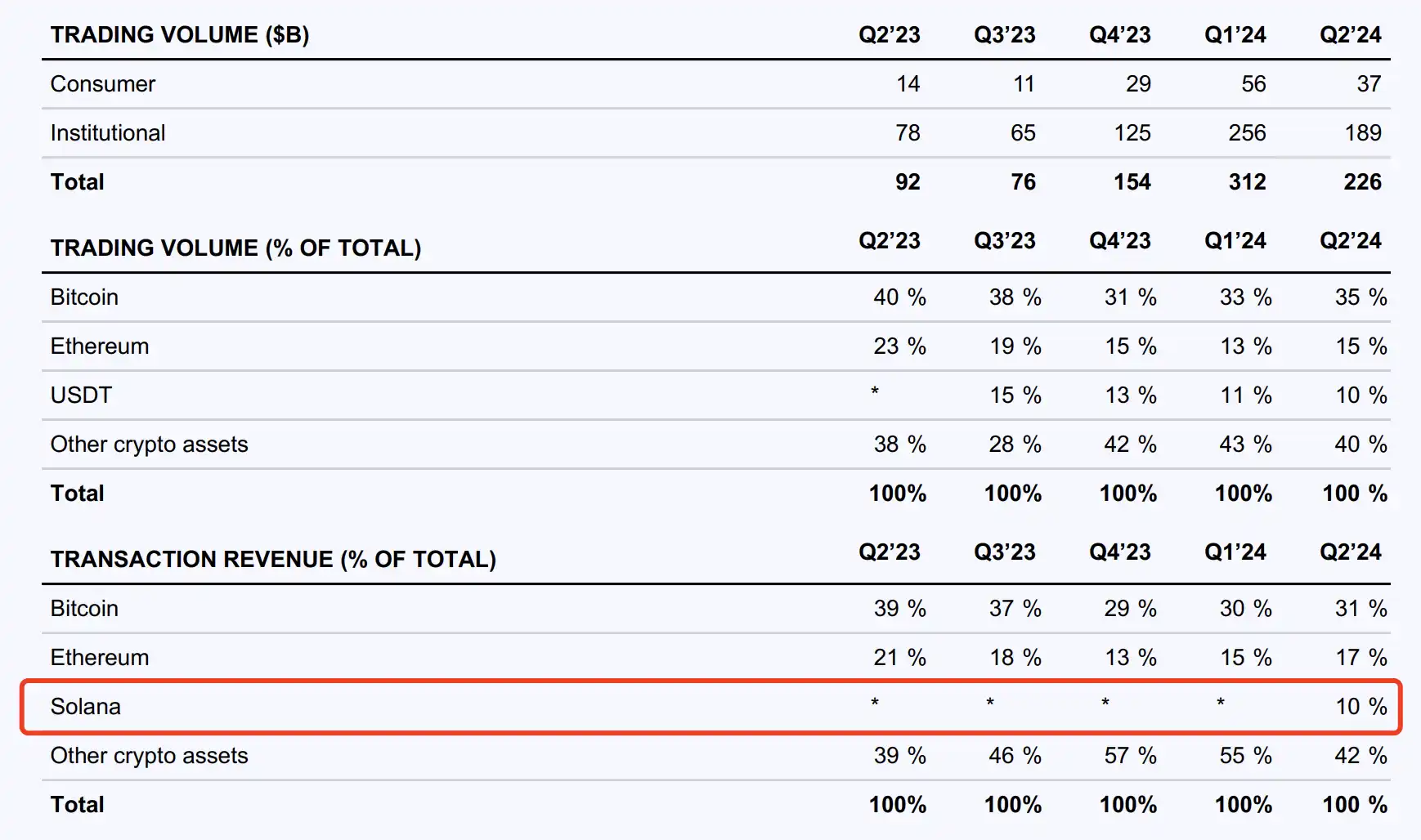 尽管整体市场交易量有所下降,但 Coinbase 通过增强服务订阅收入和扩展新的收入渠道,成功维持了其营收的稳定增长。值得注意的是,Coinbase 还首次公布了 SOL 交易的收入,标志着其在多样化资产管理上迈出了新步伐。