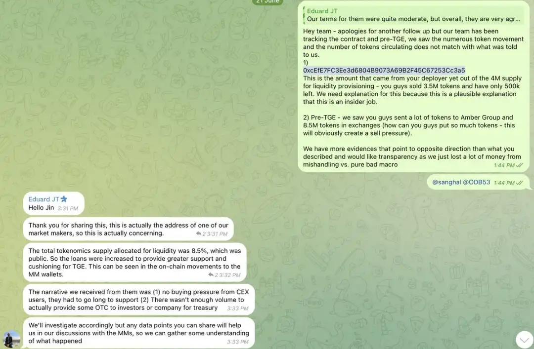 · 声称其中一位做市商在 TGE 时售出了 400 万枚代币中的 350 万枚:https://etherscan.io/address/0xcEfE7FC3Ee3d6804B9073A69B2F45C67253Cc3a5#tokentxns