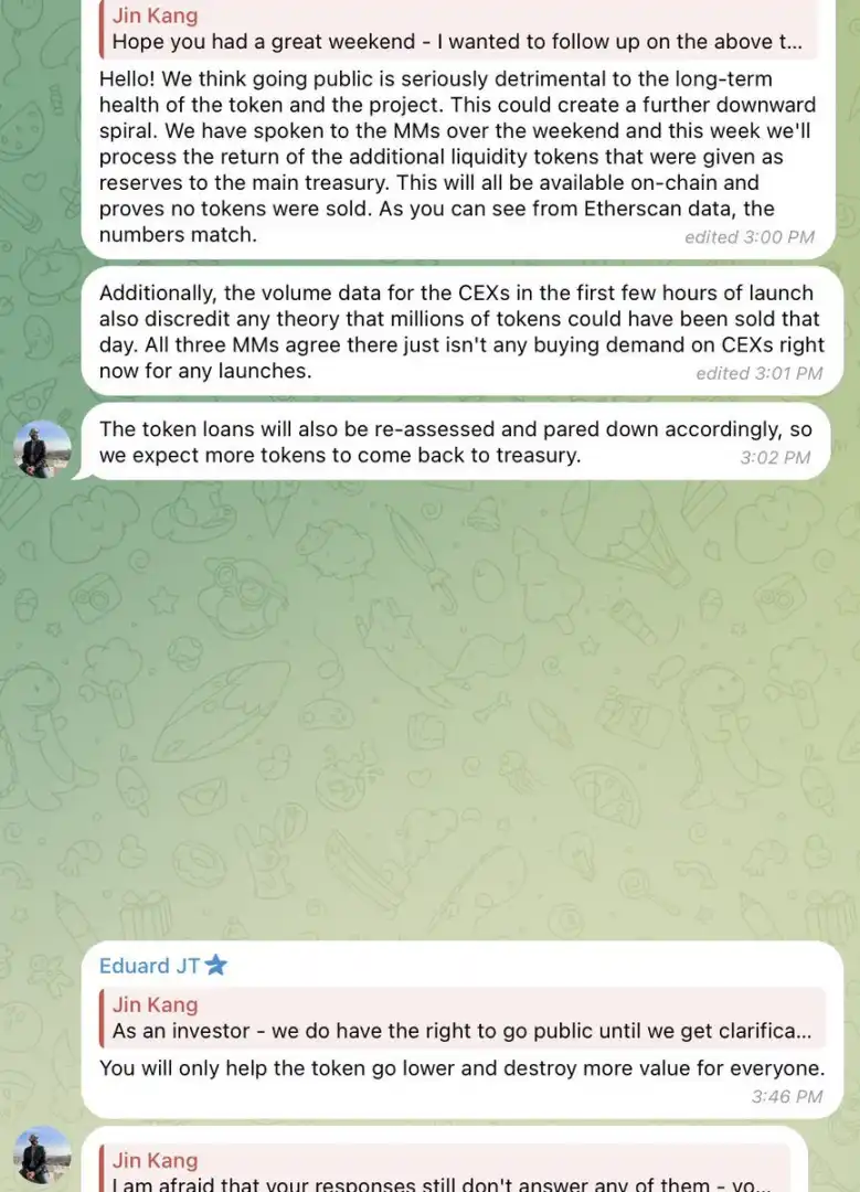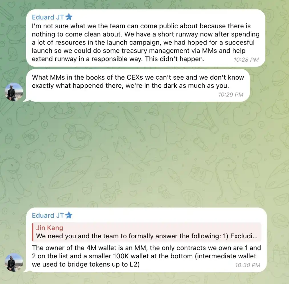 但该回应并没有「堵住众口」,加密 KOL Jin Kang 今日在 X 平台爆料,对团队的不透明等问题进行质疑,并公开了与 ZKX 团队的对话,希望投资者发声,并要求相关做市商和 CEX 给出解释。以下为内容详情。