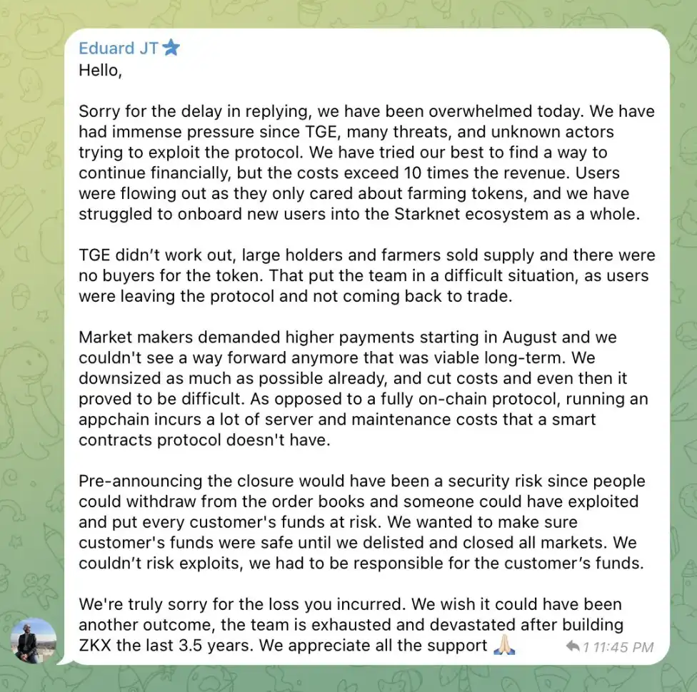 7 月 30 日,衍生品 DEX ZKX 宣布停止运营,称无法找到经济可行的协议路径。但部分社区用户对停运一事进行质疑,此前一个多月还宣布融资了 760 万美元,而 TGE 才刚刚开始几周便停运,似乎不合常理。