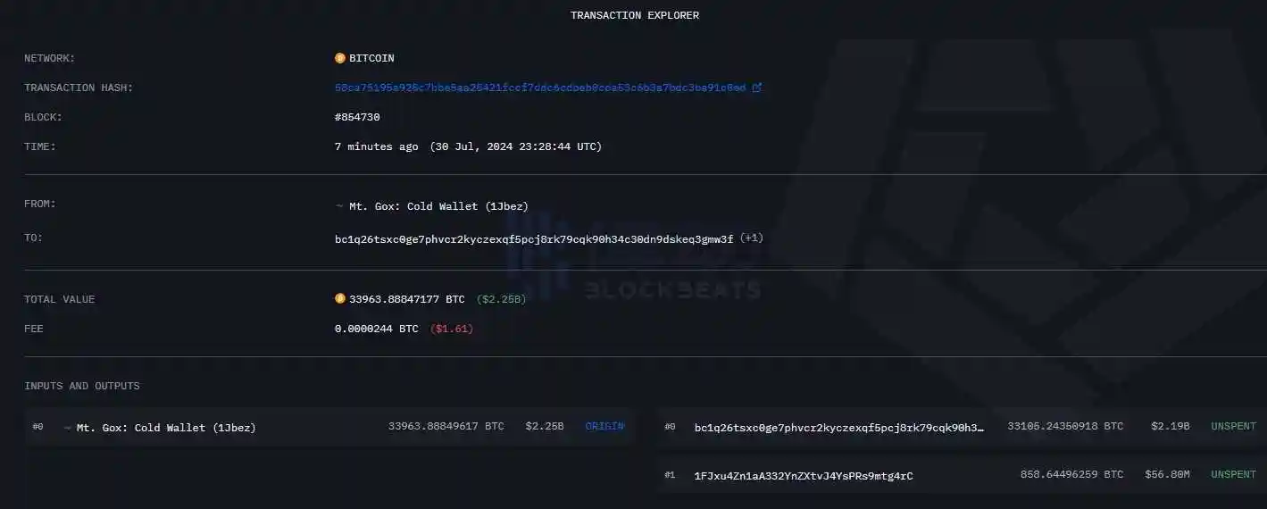 而在此前的 7 月 31 日,门头沟 Mt. Gox 地址 6 分钟前向两个地址转出 33,963.888 枚比特币,价值约合 22.5 亿美元。其中向昨日测试地址转入 33,105 枚比特币,另向一新建地址转入 858.644 枚比特币。据余烬监测,在当日转出 33963.888 枚比特币后,门头沟 Mt. Gox 地址仍持有 46,162 枚比特币,价值约合 30.56 亿美元。