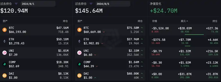 在「 85 」暴跌之前,根据 ARKHAM 数据,B2C 2 Group 链上公开地址在 8 月 1 日至 8 月 5 日总持仓量净值在增长。主要变化为:ETH 持仓增长 4650 枚,BTC 持仓增长 531.52 枚,同时还增持了 21.65 万枚 UNI、 2.3 万枚 COMP、 3.2 万枚 DAI。详细数据如下图所示。