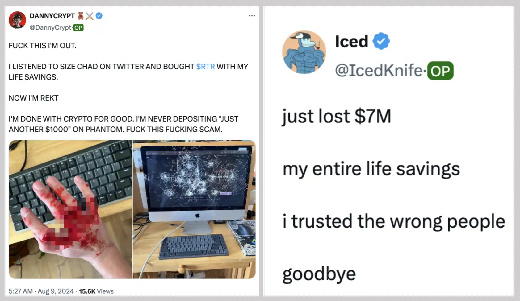 而社区用户 DANNYCRYPT 放出了受伤的手背和被砸碎屏幕的电脑照片,配文「我用毕生积蓄买了$RTR。现在我知道了,我永远不再使用加密货币了。我绝不会在 Phantom 上存入哪怕 1000 美元」。这个该死的骗局。」