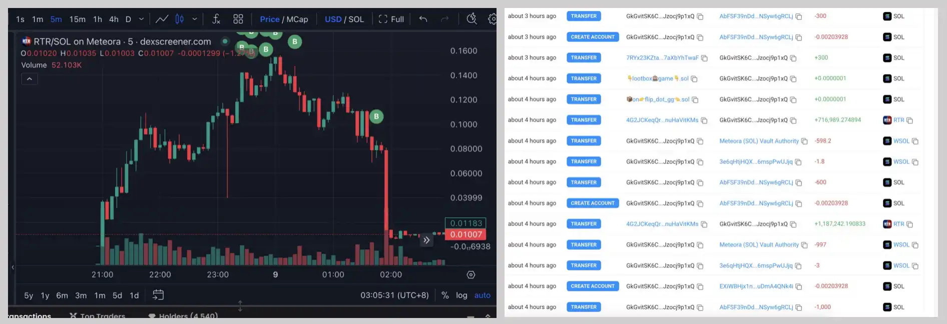 一个以 GkGv 开头的钱包地址被监测到花费 91 万美元在高点买入 RTR,四小时后以 1.8 万美元卖出了所有持仓,损失 89 万美元。
