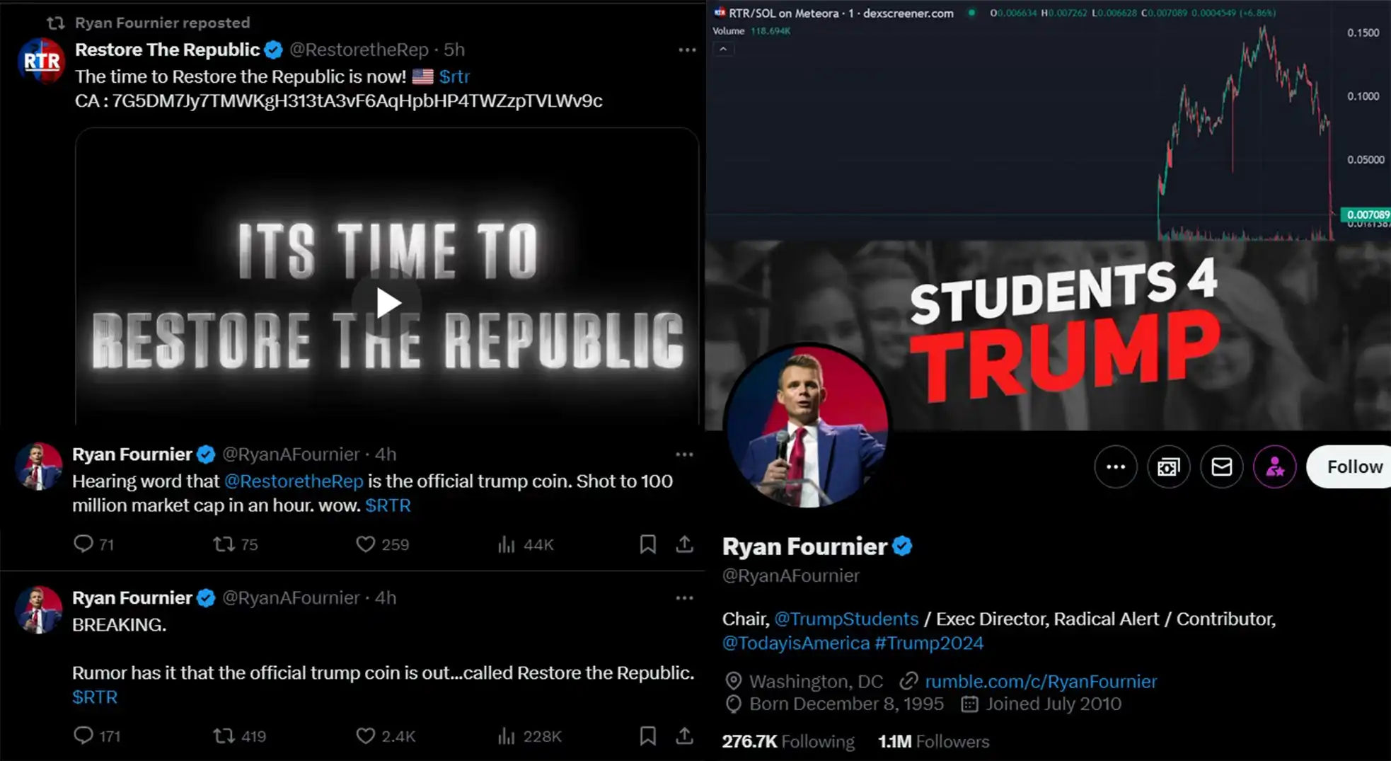 RTR的故事始于特朗普粉丝组织「TrumpStudents」的主席 Ryan Fournier,现在他已经删除了所有关于代币的宣传推文。根据社区流传的截图显示,Ryan Fournier 在昨晚放出了代币$RTR「Restore the Republic」的合约地址,并表示「有传言称,官方的特朗普代币已经面世……名为「Restore the Republic」」。