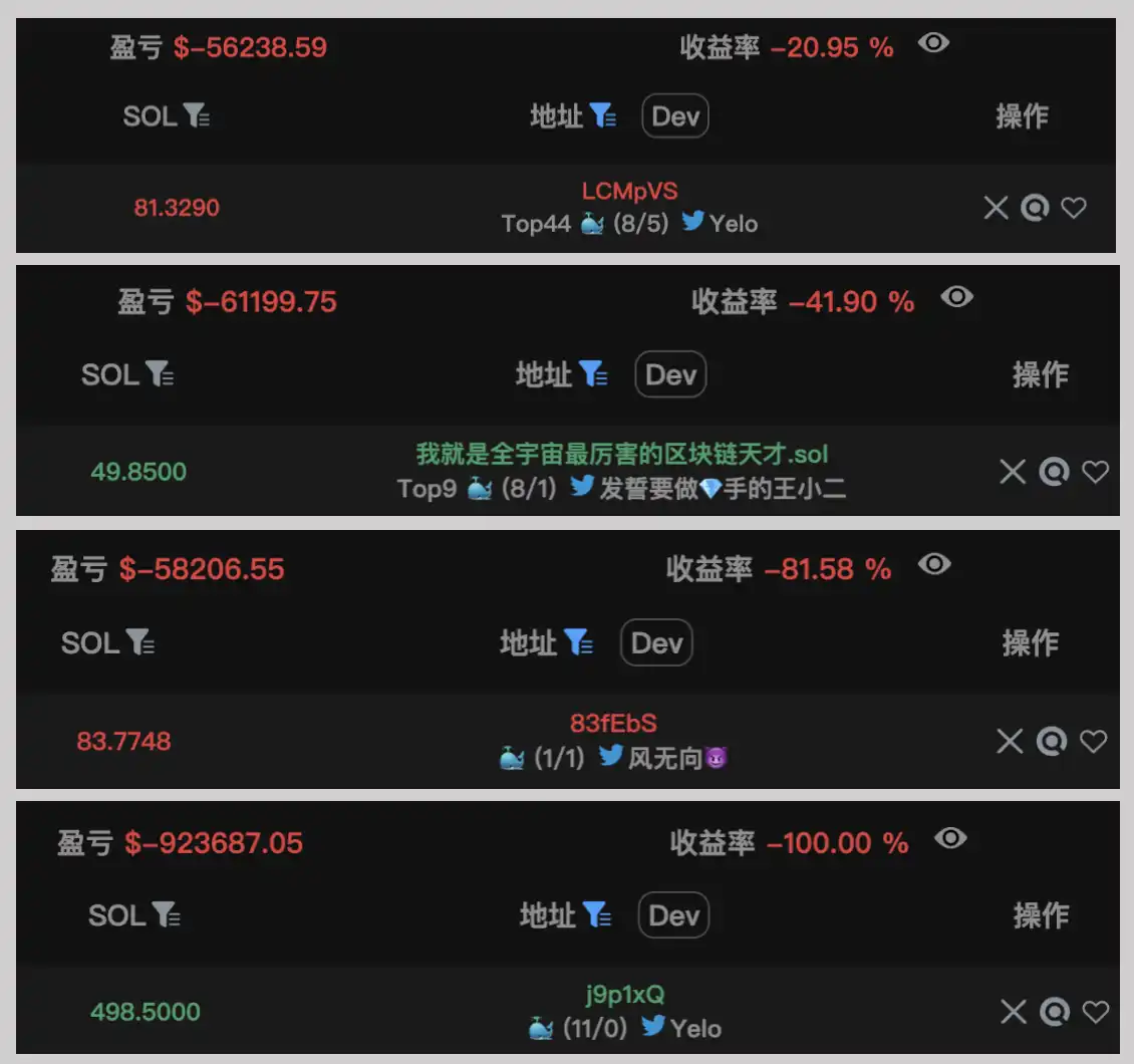 许多胜率比较高的 meme KOL 在 RTR 上也遭遇了亏损,meme 大户的损失都在数万美元,其中以 j9p1 开头的地址在 RTR 上亏损了 92 万美元。