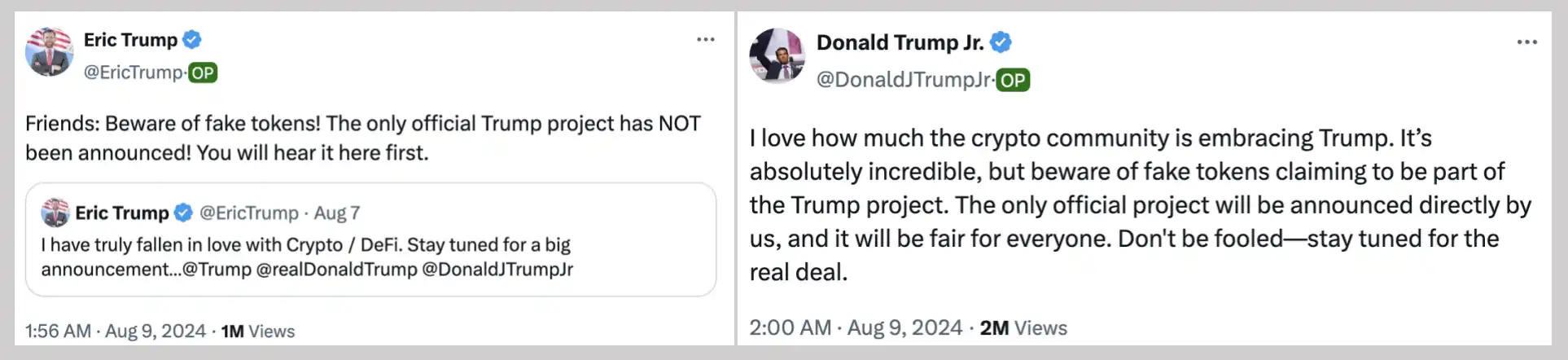 4 分钟后,Donald Trump Jr. 也发表推文「我喜欢加密货币社区对特朗普的支持。这绝对令人难以置信,但要小心声称是特朗普项目一部分的假代币。唯一的官方项目将由我们直接公布,这对每个人都是公平的。不要被愚弄了——请继续关注真正的交易。」