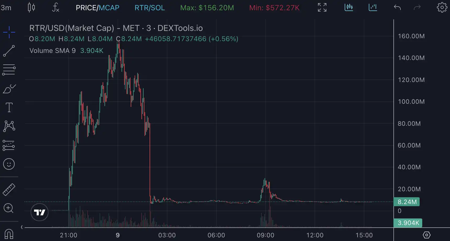 紧接着,RTR 上演了或许是近期 meme 市场上最快的市值蒸发速度,从 1.5 亿美元锐减 95% 到 8 百万只花了两个小时,其中凌晨 1 时 50 分之后的 15 分钟里,RTR 市值减少了近 7 千万美元。
