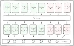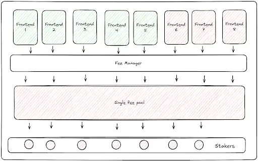 在其最简单的构造中,每个前端的费用都可以路由到单独的特定于前端的质押模块。通过选择质押到哪个前端,代币持有者将能够决定其收取哪些费用,并避免任何使自己陷入法律风险的费用。例如,代币持有者可以仅质押到与已获得欧洲所有监管部门批准的前端相关的模块。虽然这种设计听起来很简单,但实际上相当复杂。50 个不同的前端可能有 50 个质押池,费用的稀释可能会对代币价值产生不利影响。