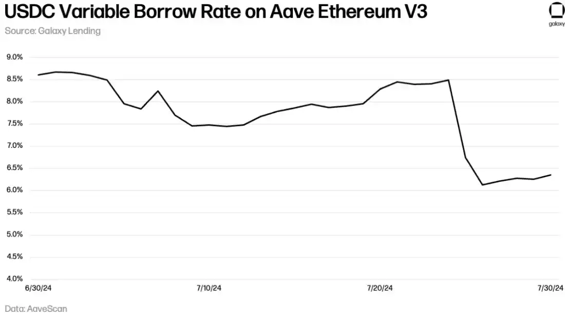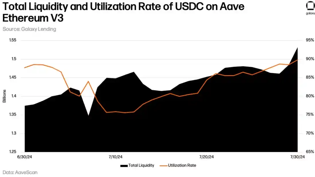 这一变化受到了积极的反馈,降低了 DeFi 中的杠杆成本。在七月,以太坊 Aave V3 上的 USDC 总流动性从 13.7 亿美元增加至 15.3 亿美元,增长了 1.6 亿美元。同时,利用率从 87.7% 上升到 89.9%,显示出强劲的借贷需求超过了供应的增长,这很可能是由于借贷利率的下降。