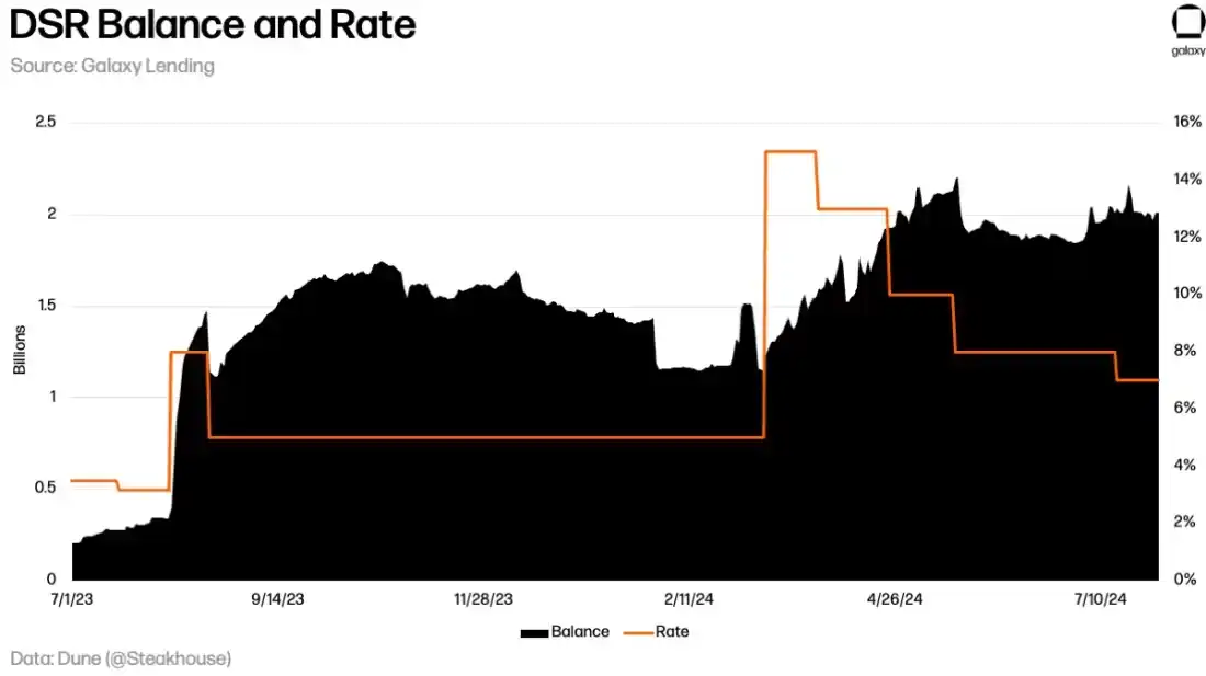 在三月,Maker 提高了 Dai Savings Rate (DSR),以应对由 Ethena 和质押 Ethena USD (sUSDe) 的收益引发的 DAI 卖压。这一调整导致 Aave 的借贷利率与质押 DAI 的收益之间出现了显著的套利机会。作为回应,Aave 将其最佳收益率提高至 14%。随着 sUSDe 收益的稳定和市场的恢复,Maker 开始降低 DSR,目前 DSR 为 7%。为了保持竞争力,Aave 已根据 DSR 和 Maker 的稳定费用调整了借贷利率。