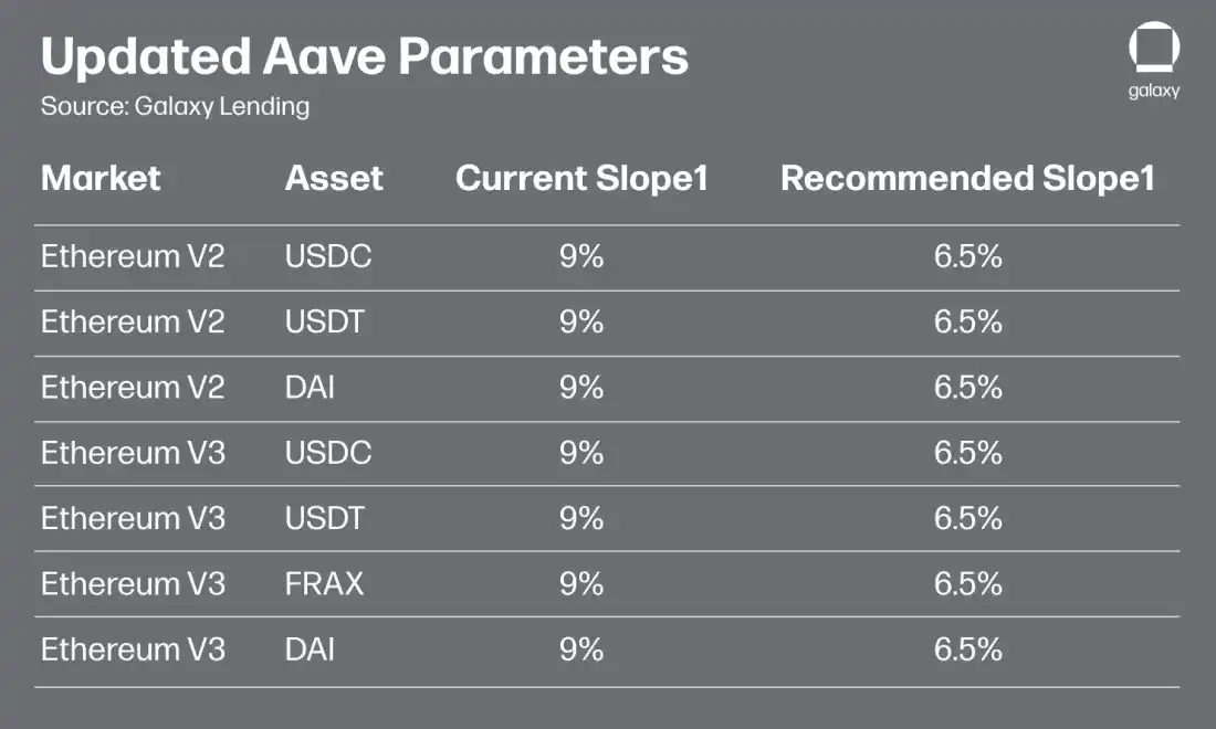7 月 25 日,Aave 治理批准了「稳定币利率曲线修正案」,该提案旨在降低协议借贷成本。此次调整将最佳借贷利率从 9% 降低至 6.5%,同时保持最佳利用率不变。这一变化影响了 Aave Ethereum V3 和 V2 中的 USDC、USDT、DAI 和 FRAX 市场。